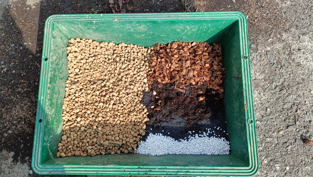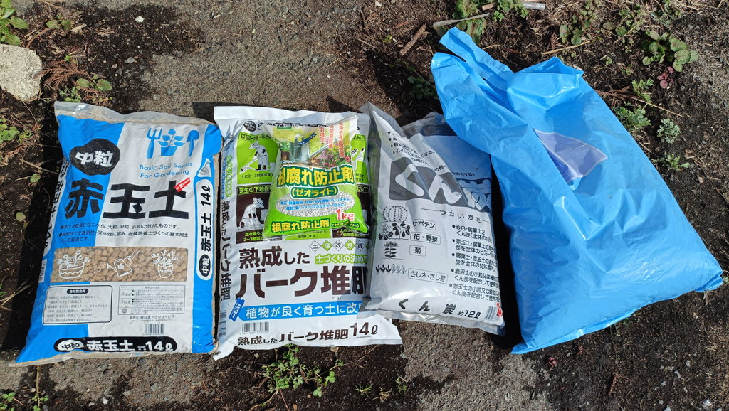 用土は赤玉土中粒、完熟バーク堆肥、くん炭、ココハスク、写真に漏れていますがゼオライトを準備しました