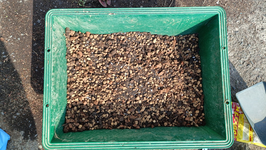 赤玉中粒50、ココハスク25、バーク堆肥10、くん炭10、ゼオライト5