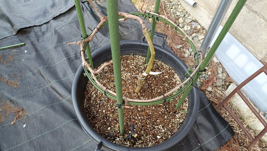 最終的にはサークル仕立てにするのですが、それは芽が出てから(樹液が通ってから)のお話