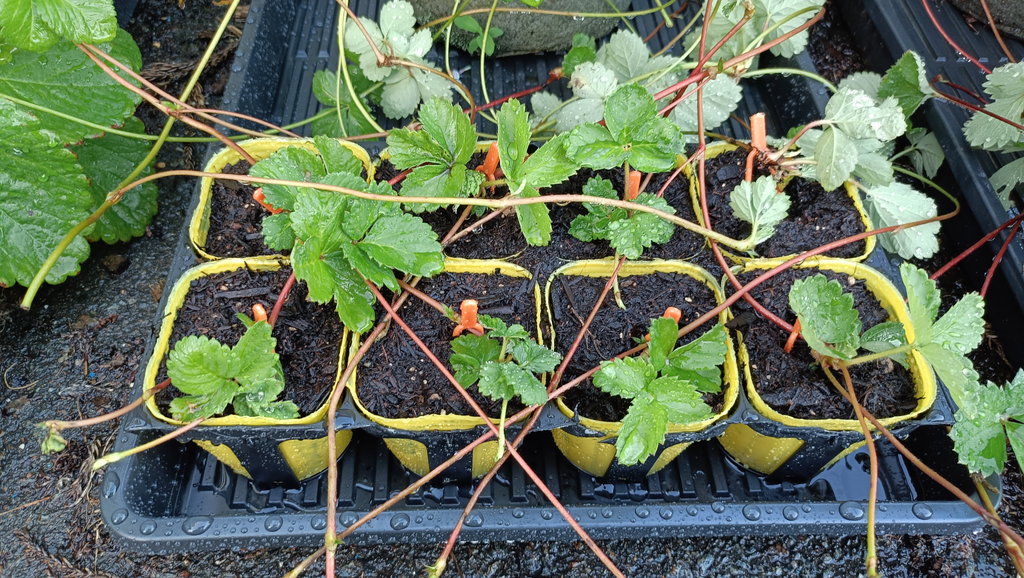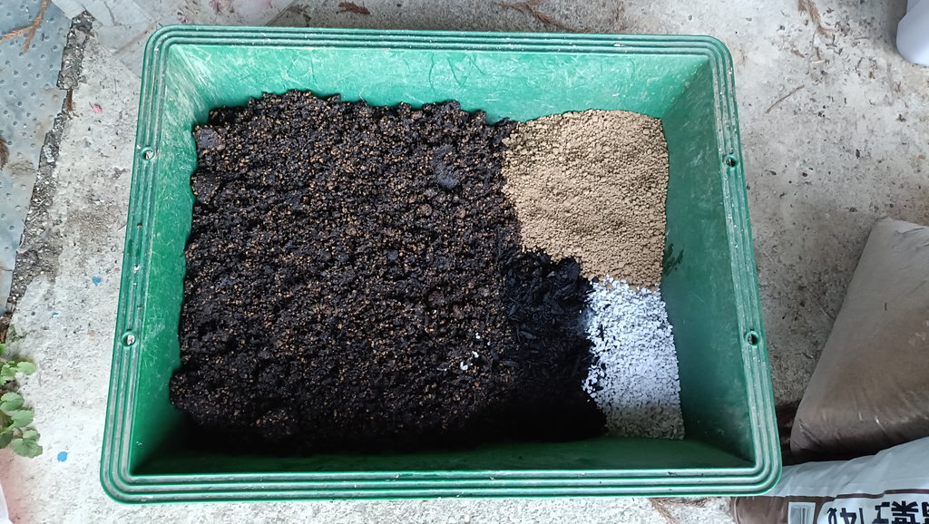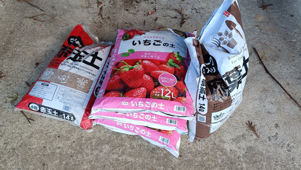 イチゴの土4:赤玉小粒1:腐葉土0.5:パーライト0.5 って感じですね。