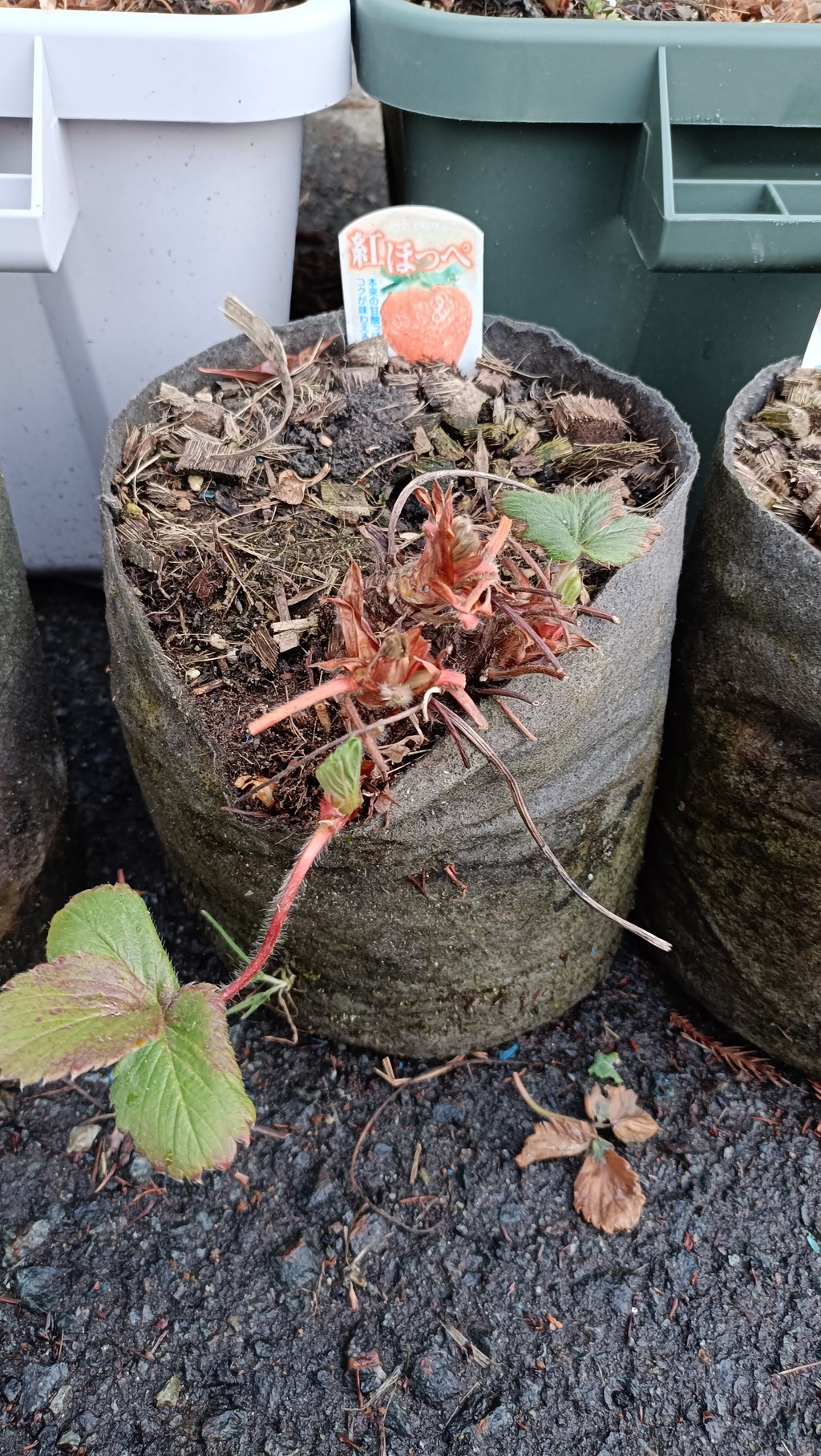 枯葉取りがだいぶ遅れてしまったので、春肥も同時にやりました。IB化成を親株用は3ヶ所×2粒、大型プランターは真ん中にパラパラ程度で入れています。
